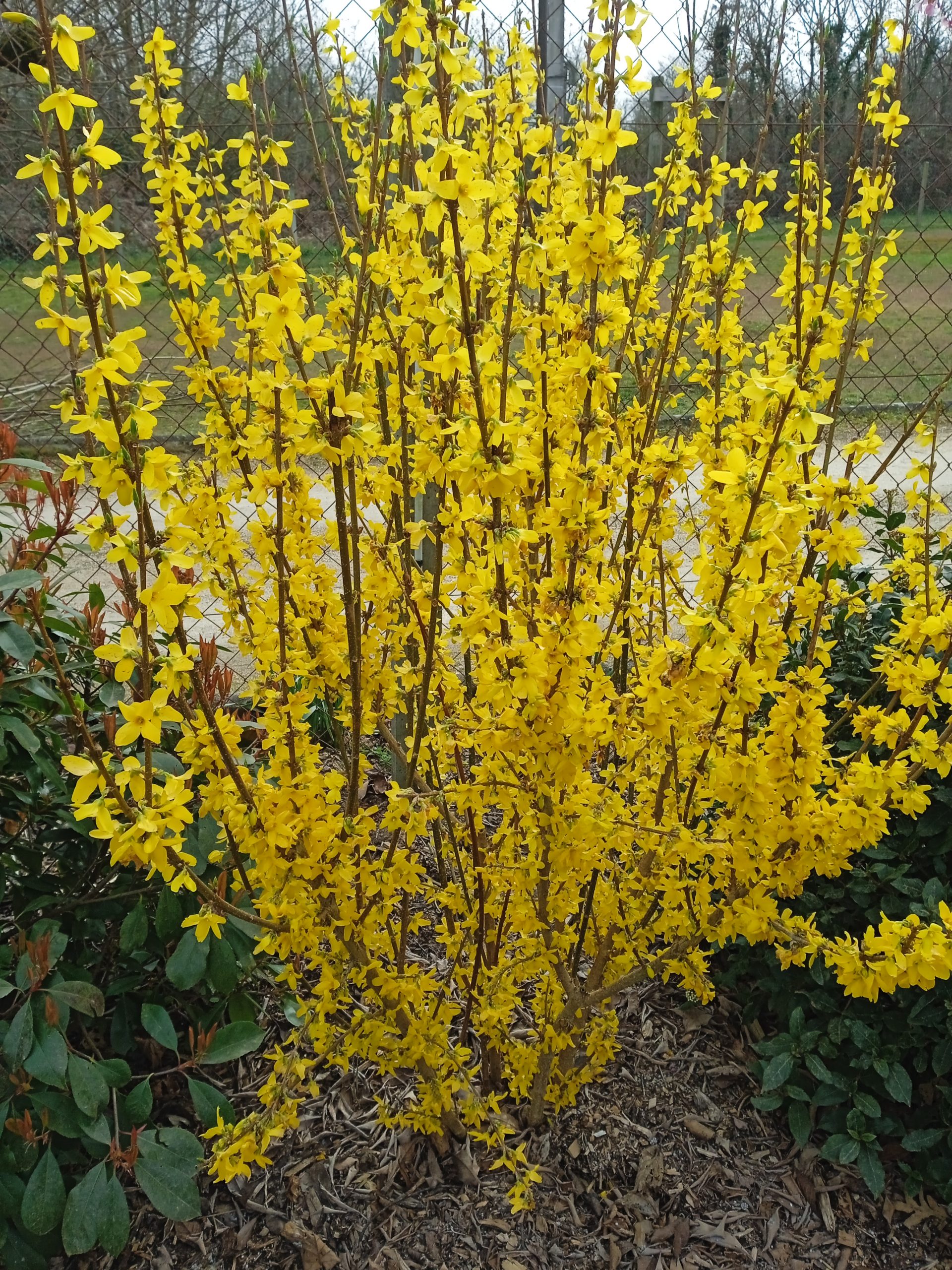 Le Forsythia intermedia ‘Lynwood Gold’, aussi appelé mimosa de Paris, est un arbuste à feuilles caduques appartenant à la famille des Oleacées, originaire d’Asie de l’Est.