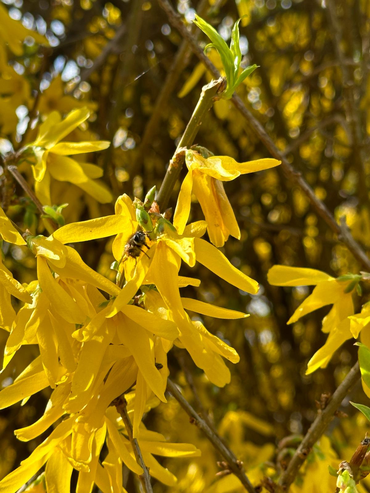 Bien que le Forsythia intermedia ‘Lynwood Gold’ ne soit pas généralement considéré comme une plante mellifère majeure pour la production de miel, sa floraison précoce en fait une ressource importante pour les abeilles au début de la saison. Sa présence dans le paysage offre aux colonies d’abeilles une source de nourriture vitale après les mois d’hiver, contribuant ainsi à soutenir la santé des populations d’abeilles et à favoriser la pollinisation des cultures et des plantes sauvages.