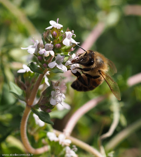 En ce qui concerne son intérêt pour les abeilles, la floraison du thym, généralement observée en mai, marque un pic d’activité pour les abeilles méditerranéennes. Les ouvrières s’engagent activement sur les fleurs de thym, principalement pour récolter l’abondant nectar. En revanche, la récolte de pollen est minime et se limite aux fleurs hermaphrodites. Cette collecte de nectar revêt une importance cruciale pour l’alimentation de la colonie au printemps. Cependant, elle donne lieu à une miellée imprévisible et fortement variable d’une année à l’autre, soumise à divers facteurs tels que le froid, la sécheresse du sol, la pluviométrie et le vent. Le miel monofloral de thym, teinté de jaune-orangé, cristallise rapidement avec une texture plutôt grossière. Son arôme est puissant mais délicatement suave, et il partage les propriétés anti-infectieuses de la plante d’origine. Dans les régions méditerranéennes, il contribue à la composition du miel polyfloral dit « de garrigue », aux côtés du romarin, du laurier-tin et des cistes.